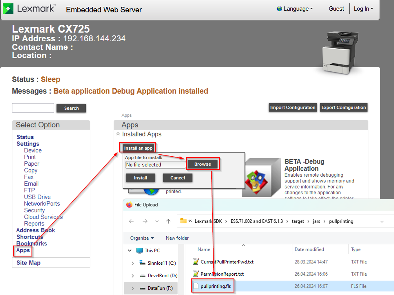 - Navegue até **"Apps" → "Instalar um aplicativo" → "Procurar" → selecione o arquivo keyboardreader-###.fls